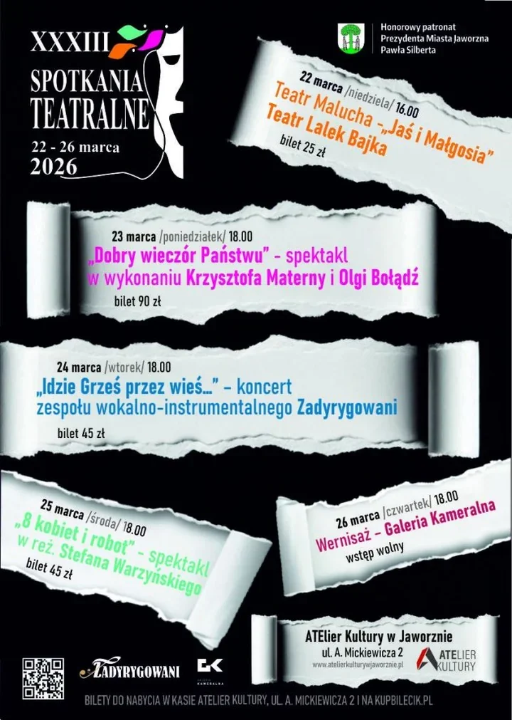 W Jaworznie wiosna zacznie się od sceny, świateł i kilku bardzo różnych artystycznych spotkań. Przez pięć dni ATElier Kultury przy ul. A. Mickiewicza 2 będzie miejscem, w którym obok klasycznej baśni pojawi się spektakl z gwiazdorską obsadą, koncert, premiera i wernisaż. Program XXXIII Spotkań Teatralnych układa się w serię wieczorów, które mają szansę przyciągnąć zarówno rodziny z dziećmi, jak i widzów szukających bardziej wymagającej propozycji.