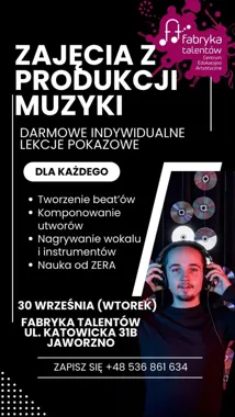 Fabryka Talentów organizuje bezpłatne lekcje pokazowe poświęcone podstawom produkcji muzycznej. Zajęcia są przeznaczone dla osób początkujących — nie jest wymagane wcześniejsze doświadczenie ani znajomość instrumentów. W trakcie spotkania uczestnicy zapoznają się z procesem tworzenia beatów, podstawami komponowania oraz technikami nagrywania wokalu i instrumentów.